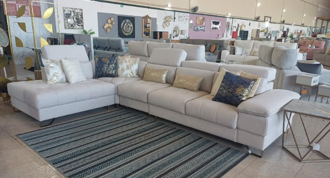 Sofá de canto com 2 assentos deslizantes e pés dourados